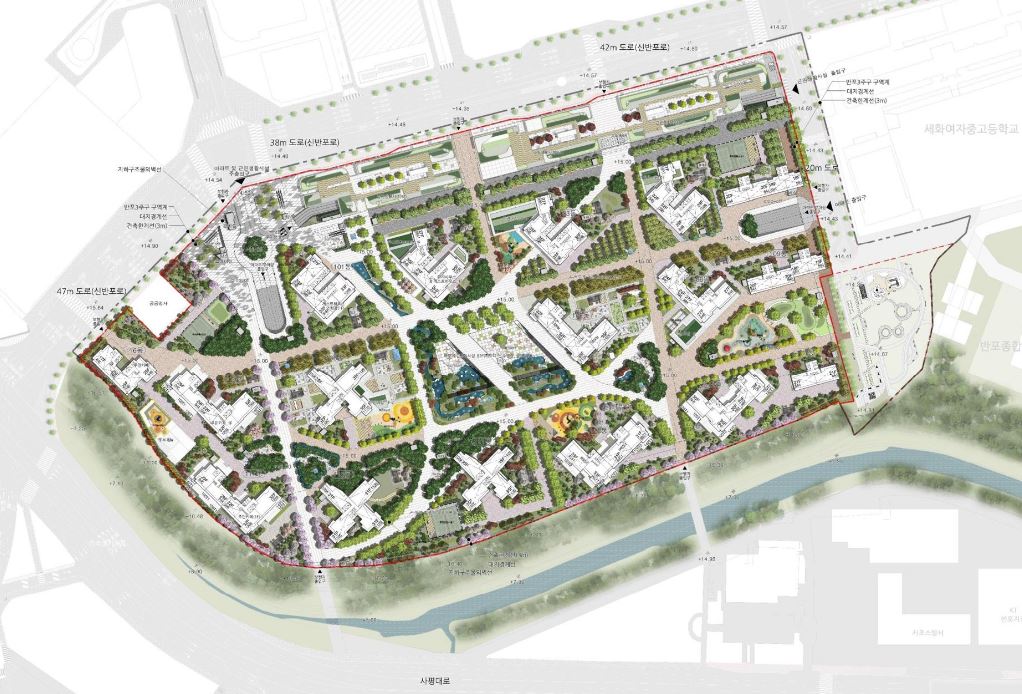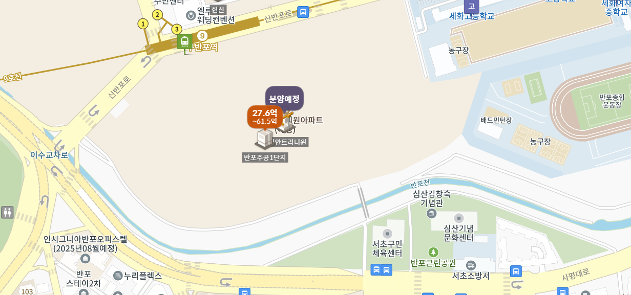 반포 래미안 트리니원 아파트는 구반포역 초역세권 단지입니다. 반포본동을 가로지르는 9호선 구반포역 바로 아랫편에 위치하게 되는데요. 단지 북쪽으로는 반포 1,2,4주구인 반포 디에이치 클래스트가 지어지고 남쪽으로는 반포천이 흐르게 됩니다. 물론 디에이치 클래스트처럼 한강 조망은 없지만, 남쪽 반포천 뷰로 뻥 뚫린 경관을 자랑할 것으로 보입니다.