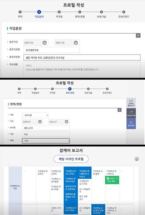 이렇게 프로필을 작성하고 본인이 '웹툰 소프트 부장으로 퇴직했다' 등 경력사항을 적으면, 내가 도전하고 싶은 분야와 어떤 직무 연관성이 있는지 자세히 분석해 줍니다. 또 게임 디자인 프로필을 가지고 있는 다른 구직자들은 어떤 역량을 가지고 있는지도 추가로 분석해서 보여줍니다. 작년에 해당 직군 구직이 몇 명 나왔는지 보여주는 화면도 있는데, 상당히 유용한 것 같습니다.